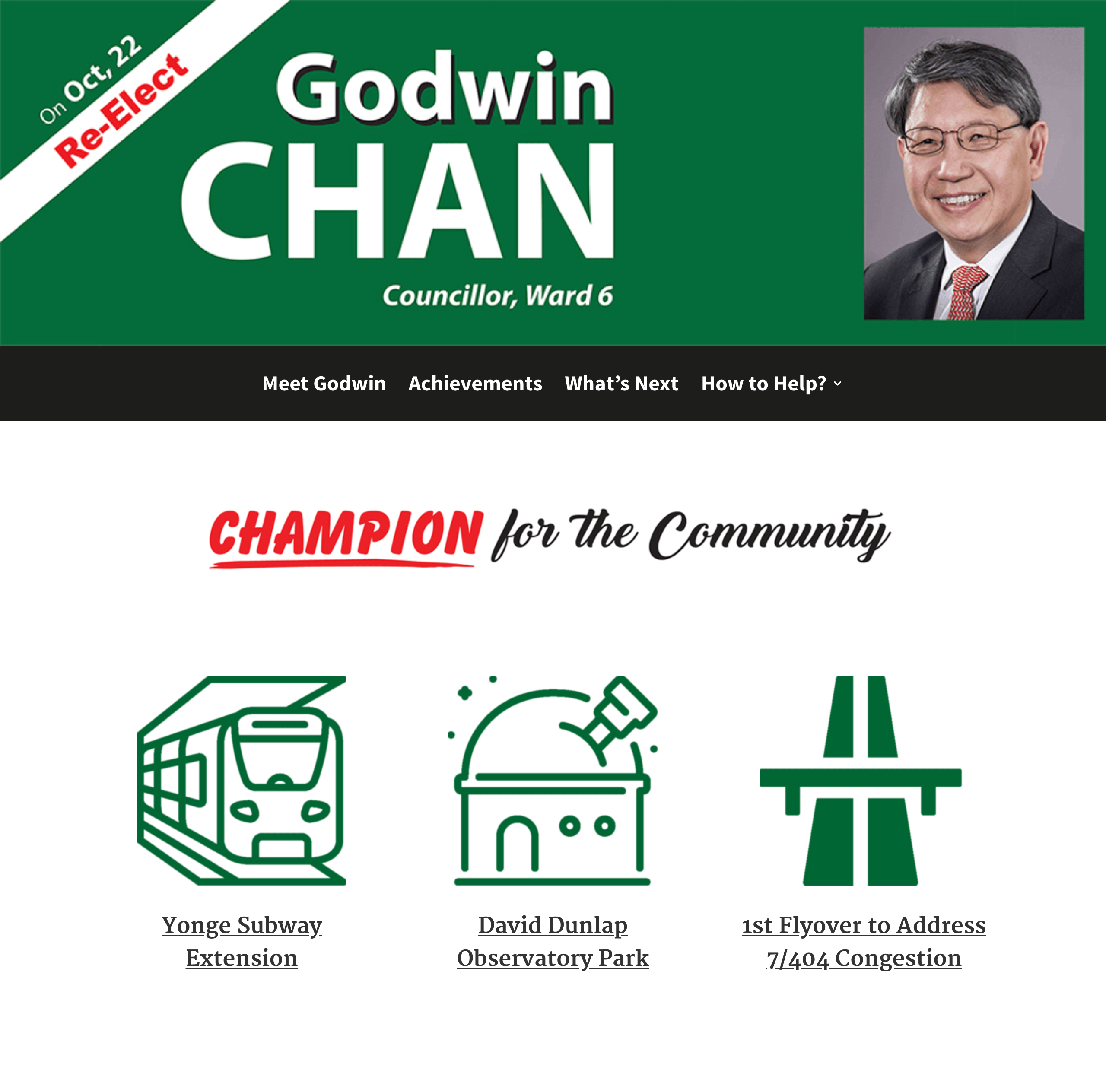 During the 2018 municipal election, we helped Incumbent Richmond Hill Councilor Godwin Chan design and develop his website in preparation for the election. We worked very closely with his campaign team to optimize it to get more engagement from voters.